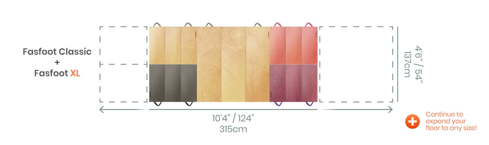 FASFOOT floors easily connect together so you can build whatever size dance floor you need. They’re available in three models: Classic, our original floor, designed for maximum portabilty; FASFOOT XL, our expanded floor with a larger surface area; and Inserts, a handle-less version of FASFOOT XL that allows additional floors to be connected on all sides. Whether you’re combining two Classic floors for duos or laying out multiple FASFOOT XLs plus Inserts for the whole troupe, FASFOOT is designed to provide a dependable performance surface for any occasion.